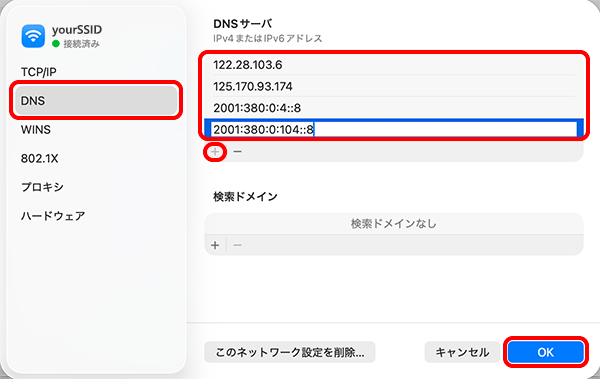 サーバーごとに下の[+]をクリックしてアドレスを入力し、[OK]をクリックします。